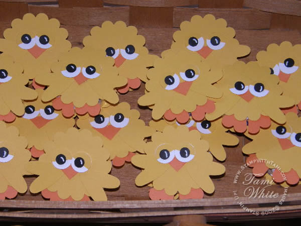 Basket full of chickies! Peppermint patty chickies that is. The cutest dang Easter candy going. This idea was from my friend Meg. These little guys were all made with Stampin’ Up punches and mini peppermint patty candy. My mom, mother in law and I made them on Saturday for Easter. We used all SU punches. He was a big hit!