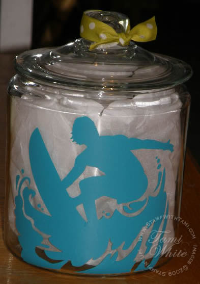 I’ve just been dying to do something fun with this surfer dude! It is the perfect summer accent, and this was a very easy and cool project. Simply rub the surfer on the jar, viola! That’s all there is to it.