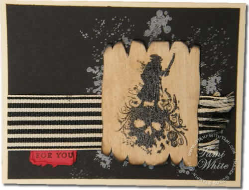 I created this to trade while I’m, here at Stampin’ Up’s convention in Salt Lake City, UT. It uses Stampin’ Up’s brand new Texture Cuts Wood Sheets, which I’ve been dying to play with. These are very good quality, and were perfect for this card. I will post a tutorial below with the “burning” technique, just want to note, please be very careful when creating this type of technique, and always have water handy. Click on the photos below for instructions of this technique.