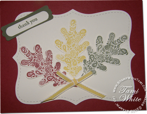 Paisley Prints is a great new stamp set (120817 wood, 121121 clear mount) that was introduced in the Holiday Mini Catalog. I love the cool style of the paisley inside the images of the tree, heart, pumpkin and leaf. This first card was created by Sharon MacKinnon, she stamped in Cherry Cobler, Delightful Daffodil and Always Artichoke for this great fall card. Below is a gallery of Paisley Prints displays from Stampin’ Up’s convention this past July (demonstrators got this set free for attending!).