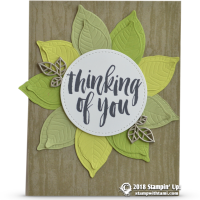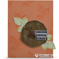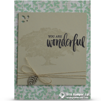 “You are wonderful” card from the new Stampin Up Rooted in Nature stamp set. The background is the matching Nature’s Poem Designer Series Paper. The Leaf Trinket is tied on with the Linen Thread. The corner accent was from the Detailed Trio punch.