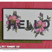 Beautiful “Hello” card from the Stampin Up Floral Statements stamp set. The flowers are colored with the Stampin’ Blends Markers. the background is created with the Balmy Blue ink.