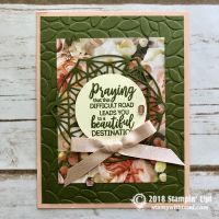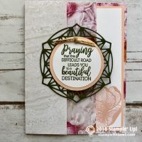 “Praying that this difficult road leads you to a beautiful destination” card sends an enlightening message of hope in times of turmoil. The words are from the Stampin Up Beautiful Promenade stamp set. The detailed designer cut behind the words is cut from the coordinating Beautiful Layers dies. The designer paper collection was also created to coordinate from the Petal Promenade series.