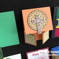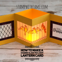 My project for today’s blog hop is this super cool tea light lantern card. It’s not just a card, it’s a work of art. It folds flat, and when you open it and pop in the tea light it glows. I created with the Stampin Up Graceful Glass suite: Painted Glass stamp set, Stained Glass framelit dies and Graceful Glass velum.
