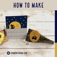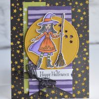 Fun witches hat “Happy Halloween” card from the Stampin Up Cauldron Bubble bundle. Featuring the Toil & Trouble Designer Series Paper and Glitter Ribbon from the new Holiday Catalog.