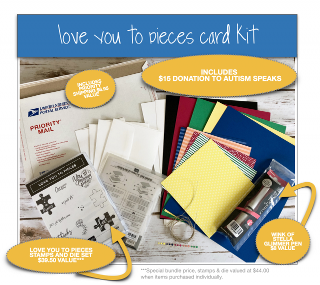 Why just purchase the stamp/die bundle, when for just a few dollars more you can get the entire card kit, that includes a donation to Autism Speaks? It’s a win-win! Click here for more details on the kits.