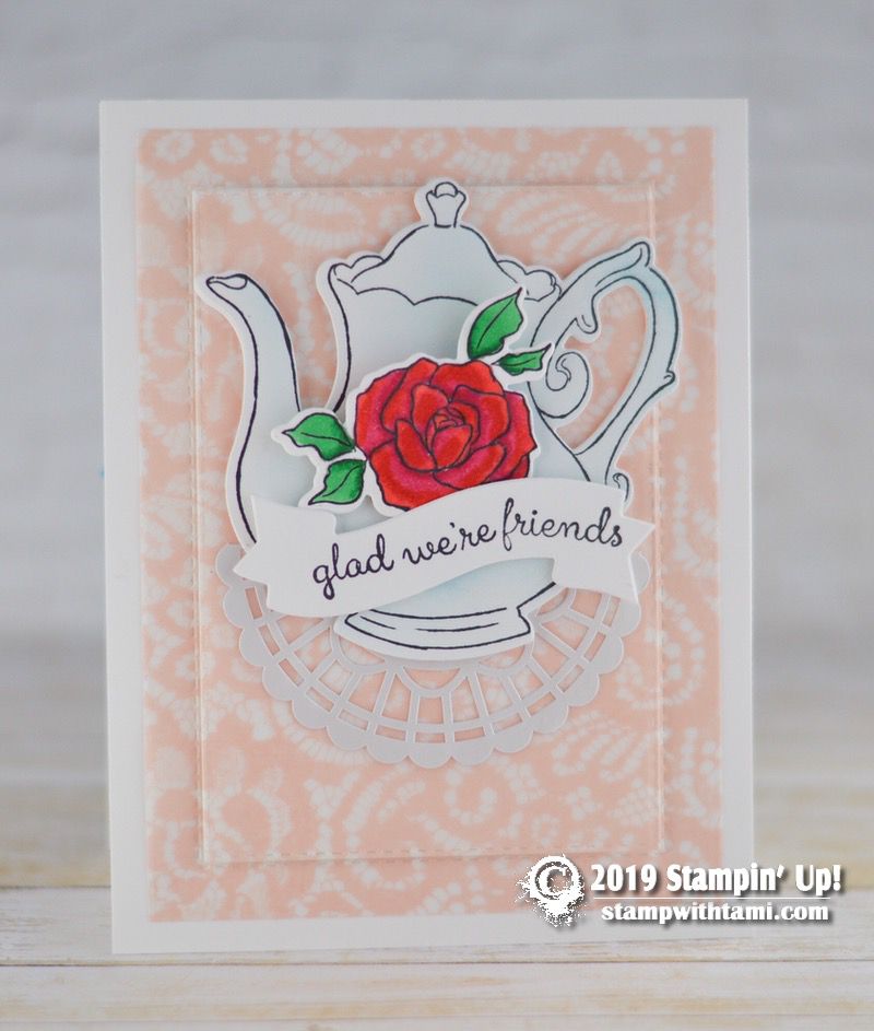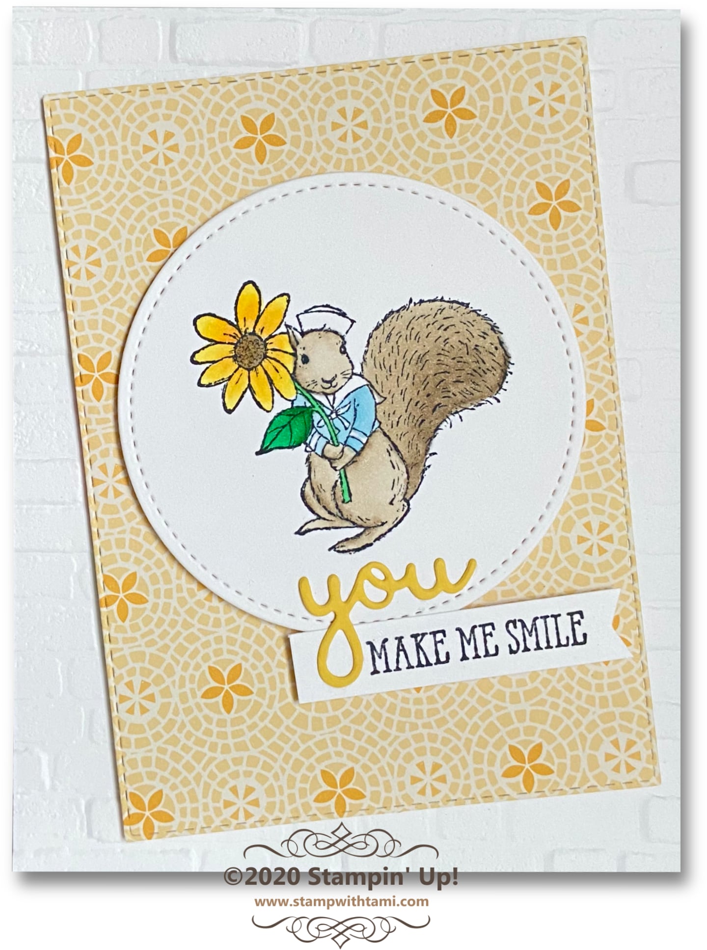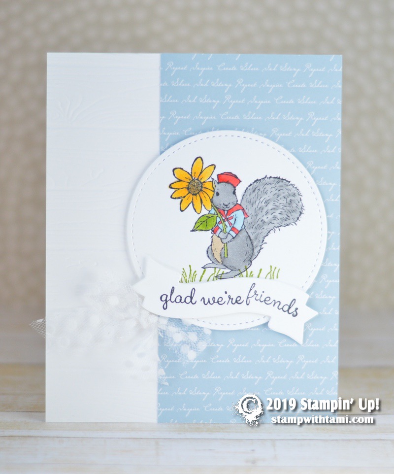 “You make me smile” card idea from the retiring Stampin Up Fable Friends Stamp Set. An adorable and cute animal set that has Easter greetings and beyond. This squirrel was colored with Stampin’ Blends markers. The designer paper is the retiring Mosaic Mood DSP. The background texture comes from the Brick & Mortar folder. The words are from the Well Said stamp set and Well Written dies.