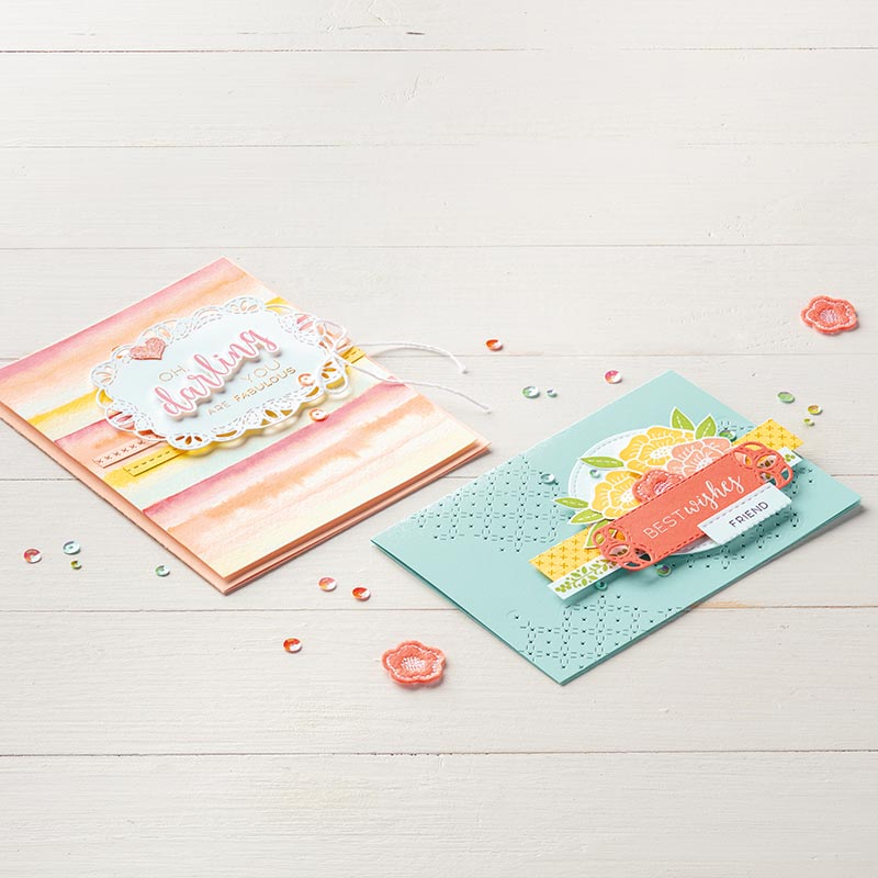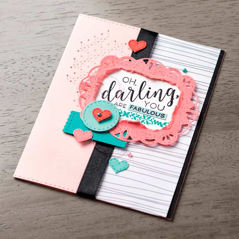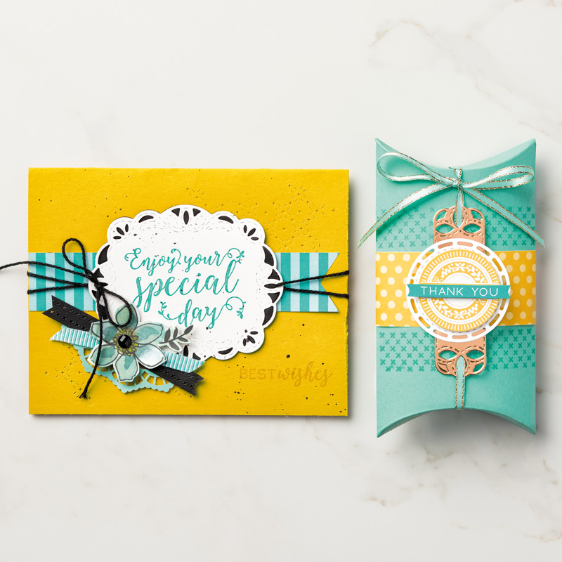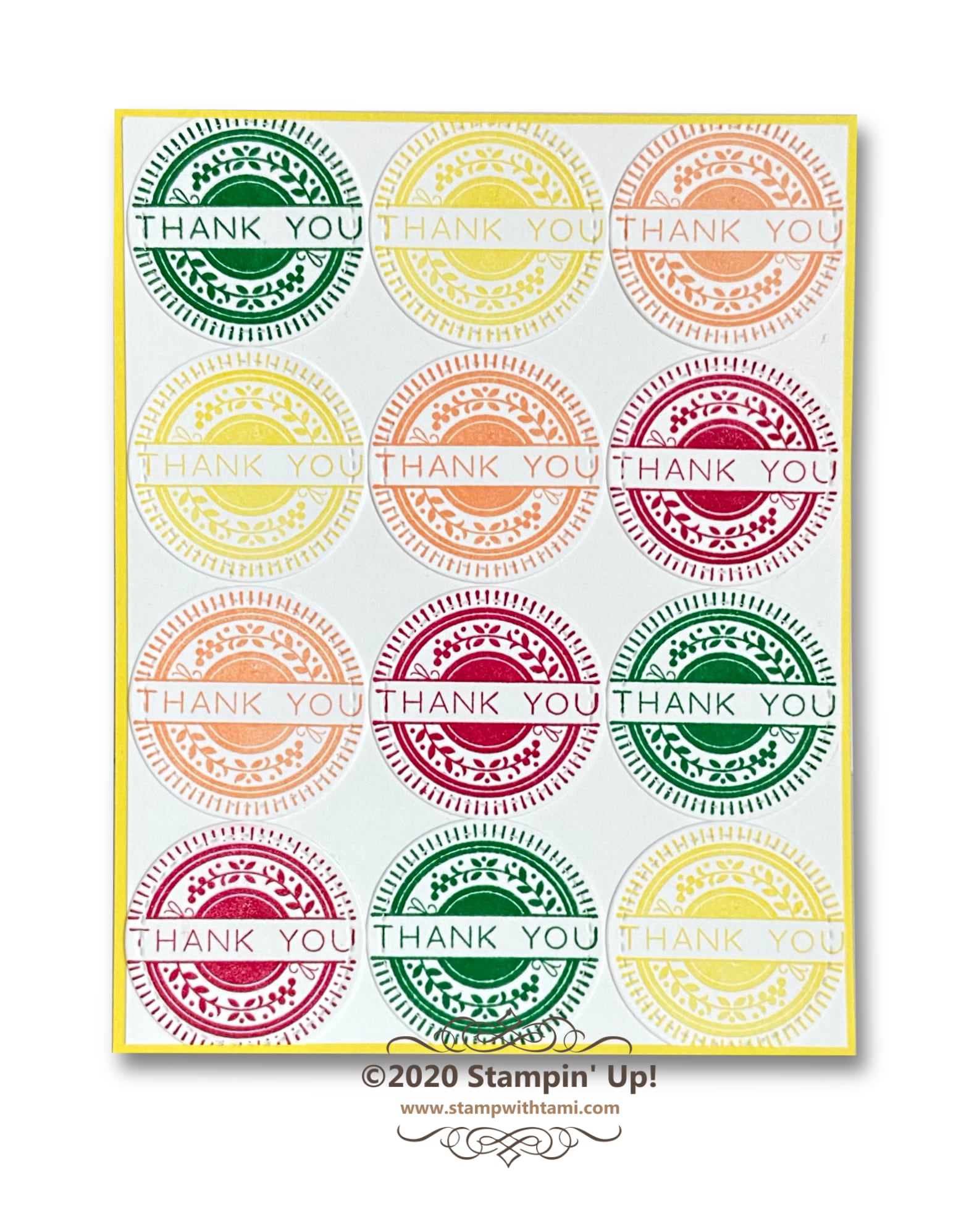 This thank you card was created with the retiring Stampin Up Stitched All Around stamp set. The colors: Lovely Lipstick, Call Me Clover and Pineapple Punch are also retiring. I’ve got a full supply list below, as well as more samples from this stamp set. The coordinating Stitched Labels Dies are also retiring and on sale.