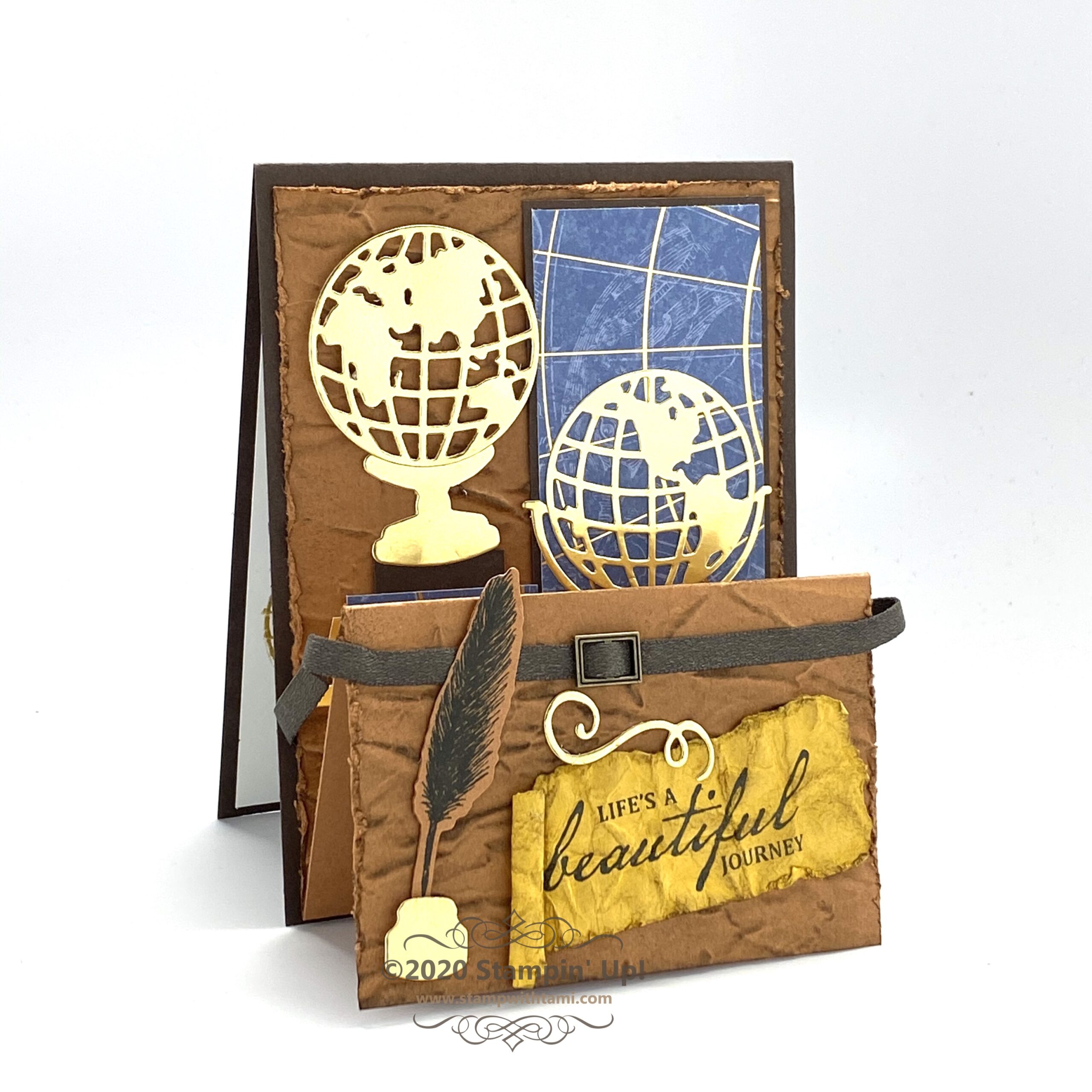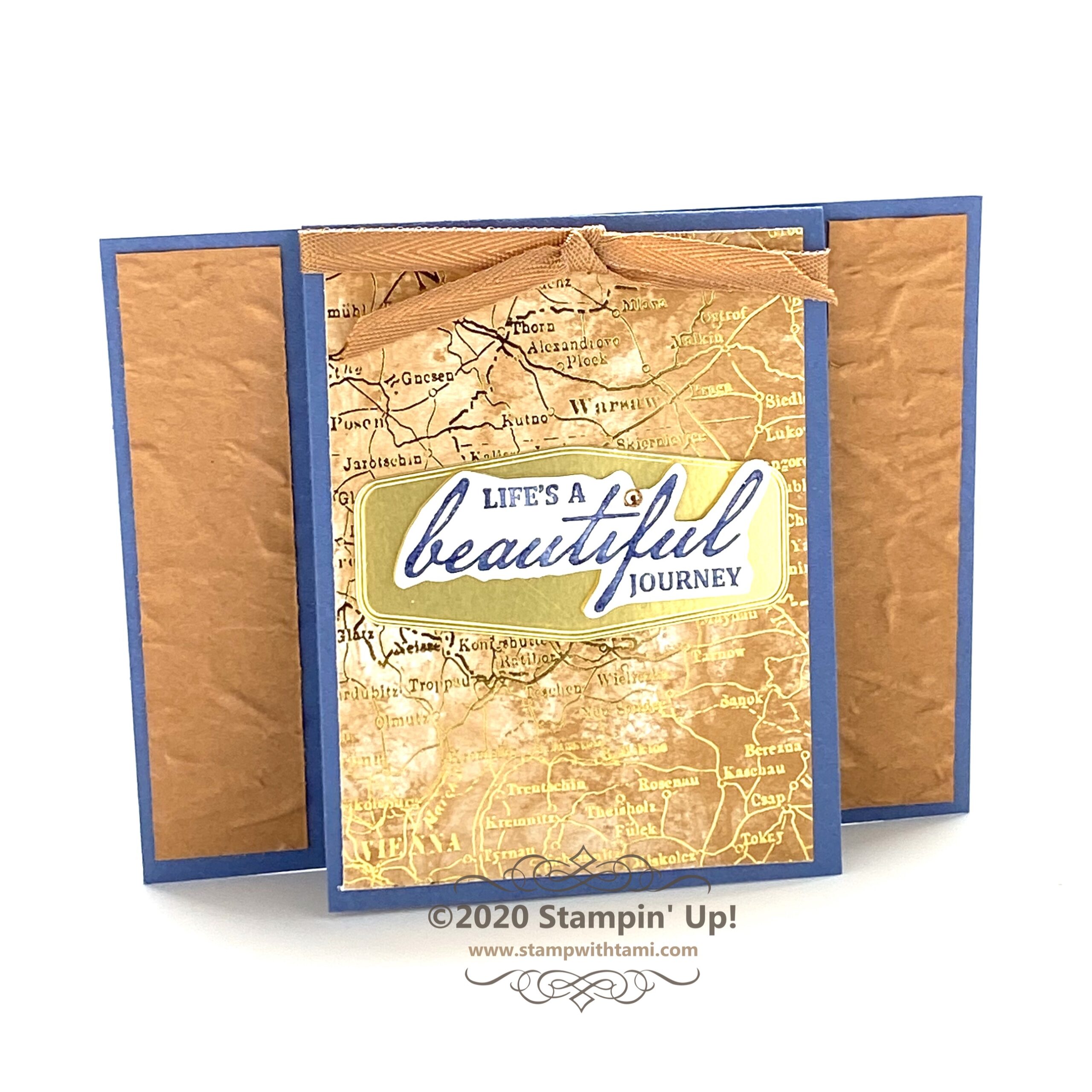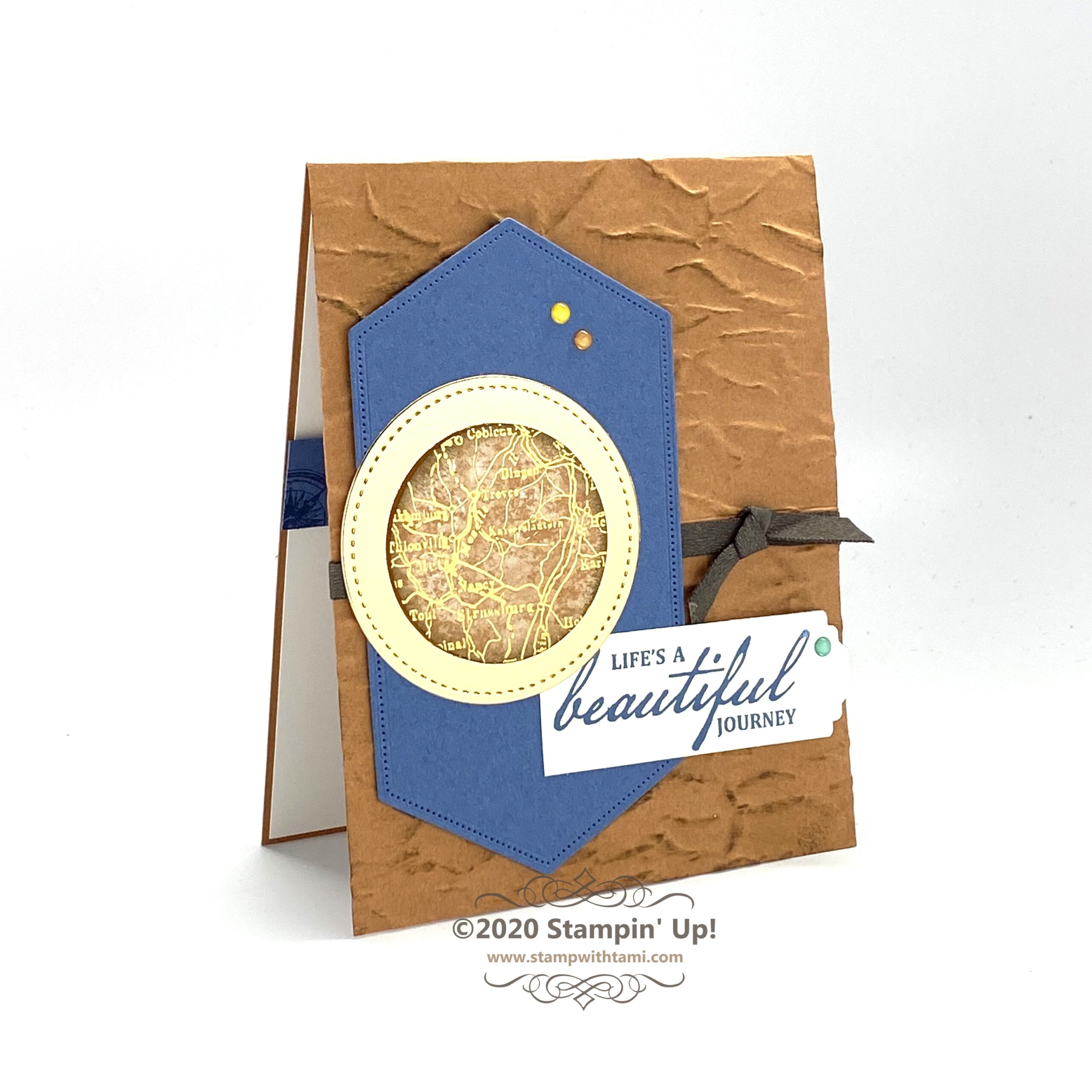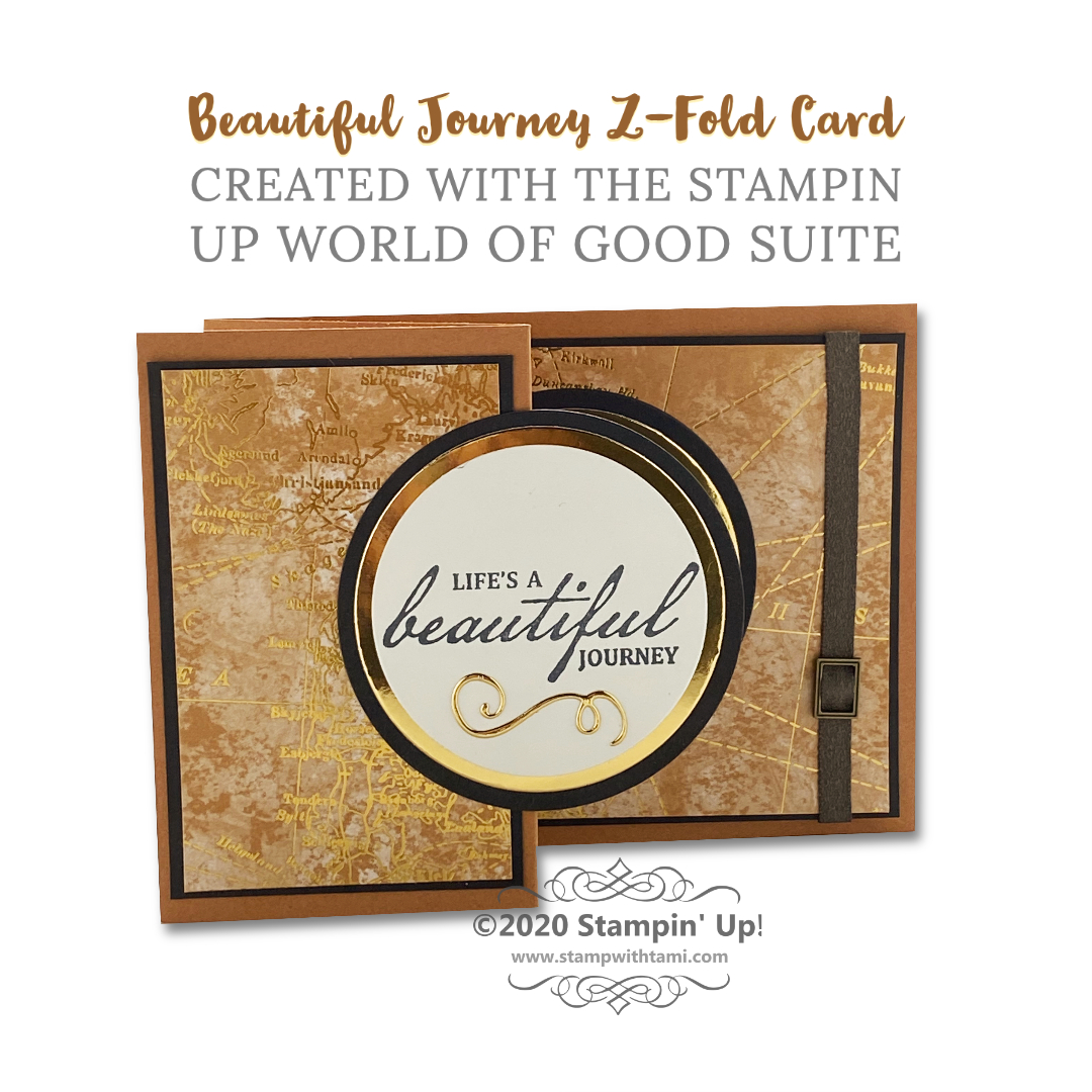 Life’s a beautiful journey…thank you for being part of mine! I mean that truly, this card reflects my appreciation for you and your support. Thank you. In this video I’ll share how to make this quick and easy z-fold card featuring the Stampin Up World of Good Suite. The brass foil layers on this card make the greetings look like metal. It’s stunning. When the card is closes, the inner circle aligns with the top circle and is hidden. So when you open it, you have a neat surprise.
