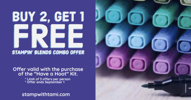 Buy 2 sets of Stampin’ Blends Marker Combos, get 1 free. Offer only valid with purchase of this kit. Limit of the 3 offers per person. These are the colors used in the class, however this offer applies to any colors of blends, even if they aren’t used in the class.