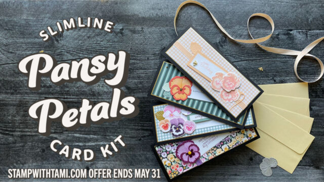My June kit is this stunning Pansy Petals Suite Slimline Card kit and class. When you order this custom designed kit, you’ll not only receive a special offer on the suite, you’ll get a free exclusive class from me. Including an easy to follow “how to” video, written instructions and bonus projects & ideas for the suite. The class has instructions to make 4 slimline cards and comes with gold slimline envelopes.
