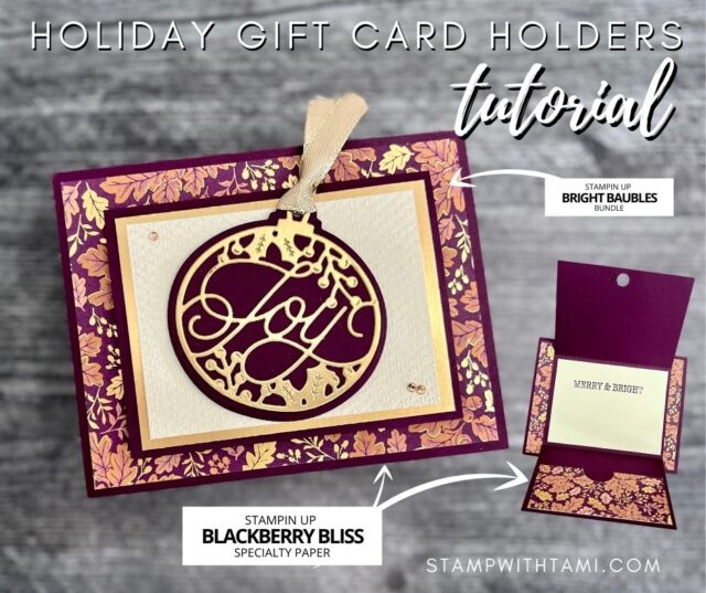 The Stampin’ Up Blackberry Beauty Specialty Paper is stunning. I paired with the Bright Baubles Bundle to create this gift card holder.