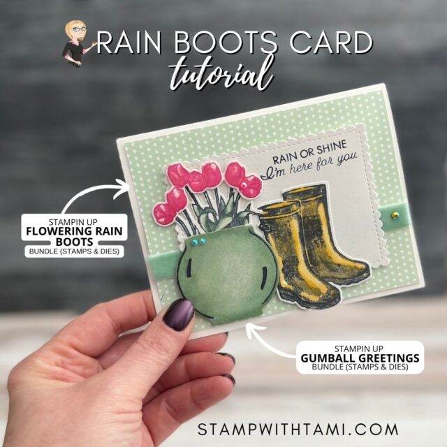 Here’s a printable with instructions and supplies for how to make the rain boots and flower vase card. This is card #6 in my Gumball Greetings series.