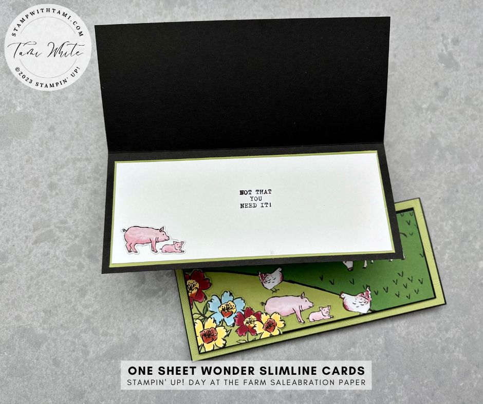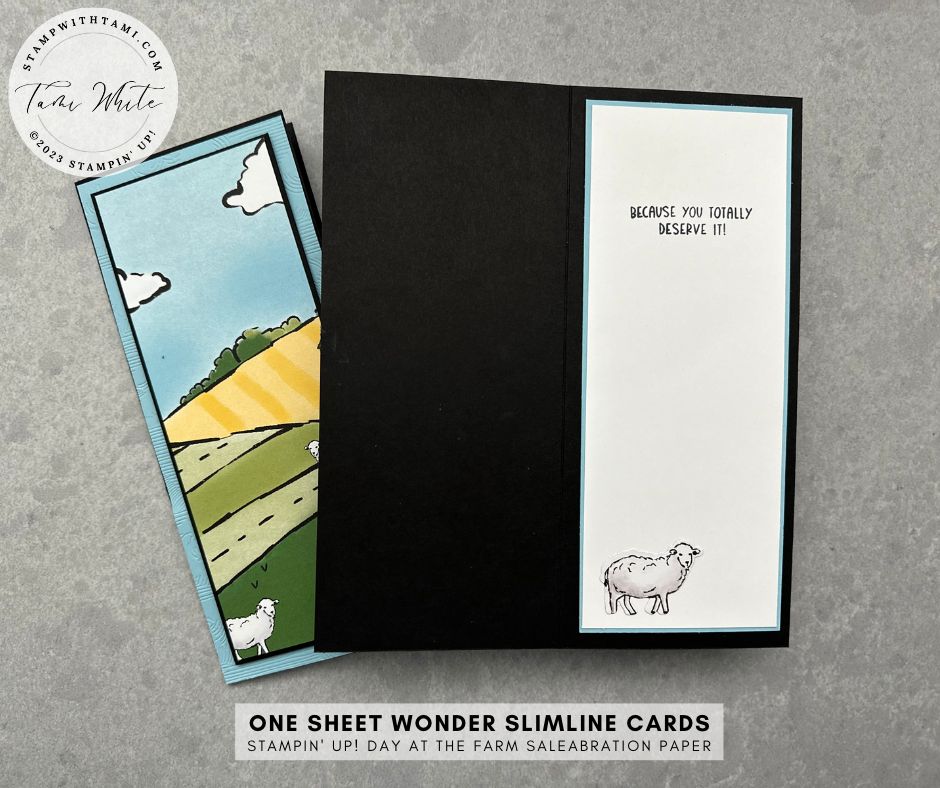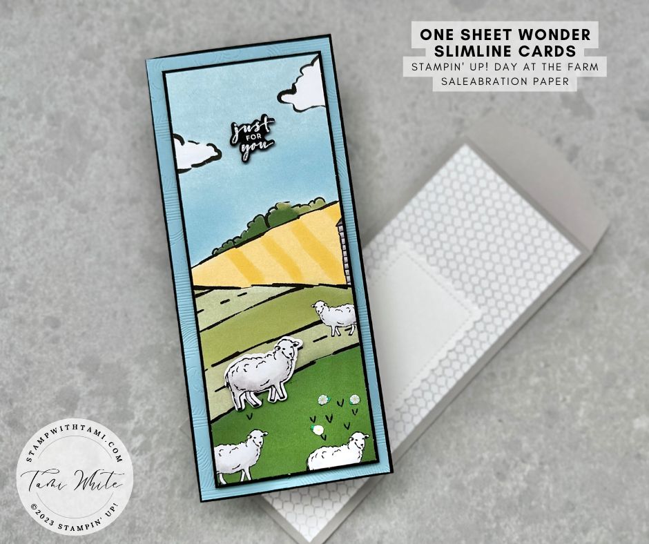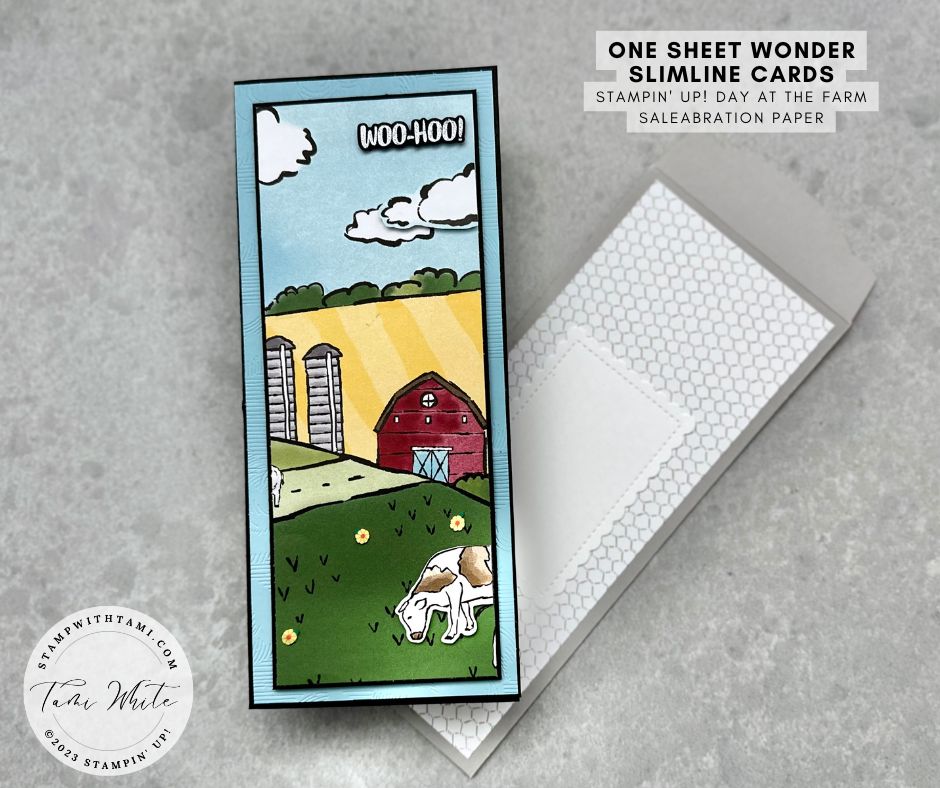 Unless you’re a scrapbooker, you have probably been saving this sheet in the Stampin’ Up! Day at the Farm DSP pack looking for a good project to make use of this great scene. How about a 4 (or 5) triptych slimline card 1 sheet wonder?